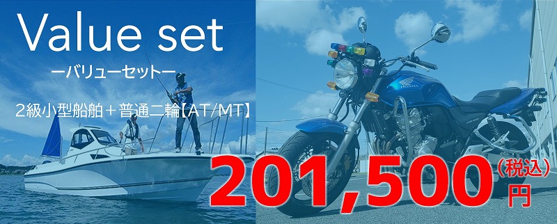 2級小型船舶操縦士と普通二輪免許のセットになります。