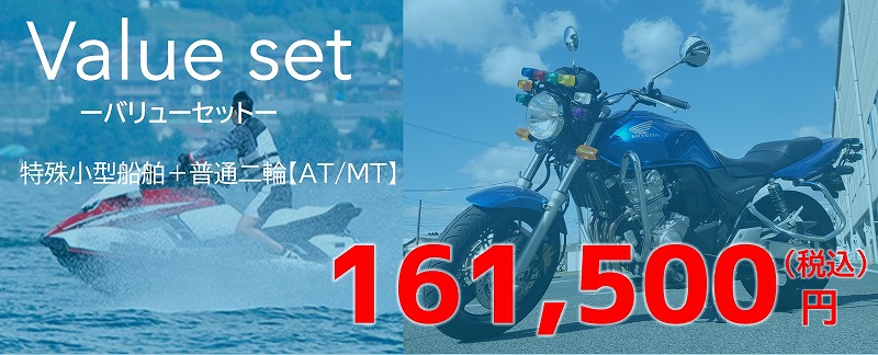 特殊小型船舶操縦士(ジェット)+普通二輪免許のセットになります。