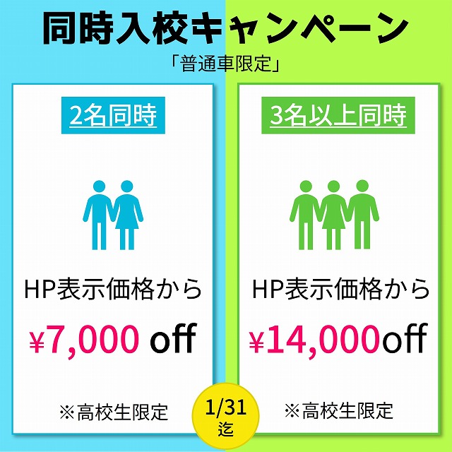 期間内に、高校生の方がwebから仮申込をされて、同時に2名以上でご入校(普通車に限る)いただくと、人数に応じてHP表示価格から割引させていただきます。