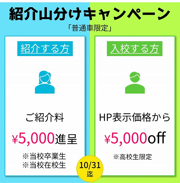 期間内に、普通免許で「高校生」の方をご紹介いただくと、ご紹介者の方に5,000円をプレゼント、ご入校される方は、HP表示価格から5,000円割引させていただきます。