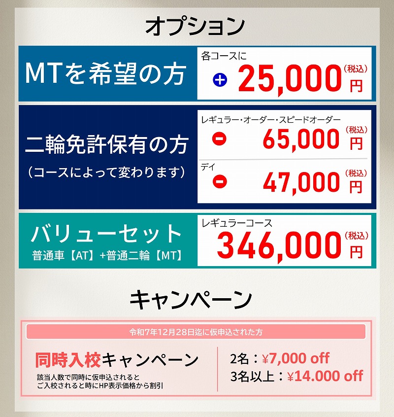 ※普通車をMTにする場合は、上記価格に+25,000円(税込)が必要になります。