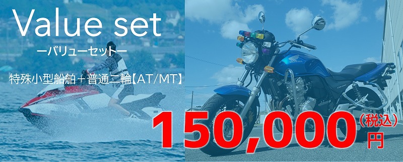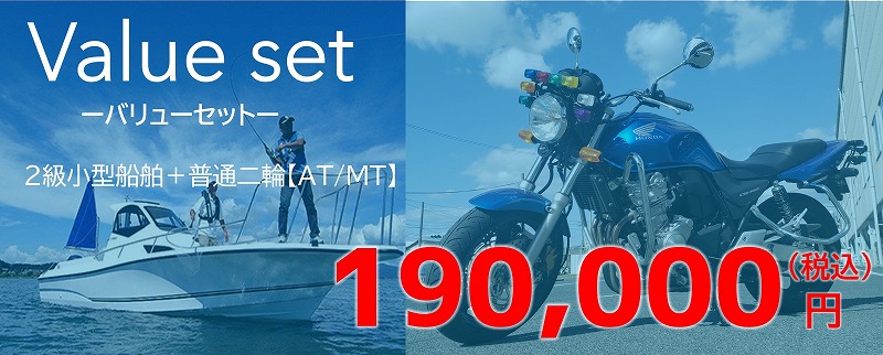 2級小型船舶操縦士と普通二輪免許のセットになります。