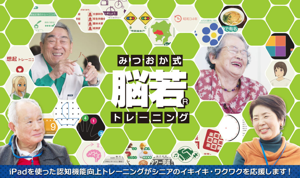 「みつおか式 脳若トレーニング」は、ITを使って皆様で楽しむ認知症予防トレーニングです。認知症予防など主な目的として、視覚・聴覚・触覚を使って体を動かします。