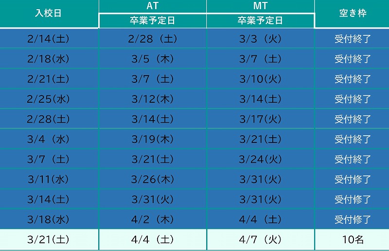 ③豪雨、積雪などの天災地変により、卒業予定日が伸びる場合がございますので、予めご了承下さい。