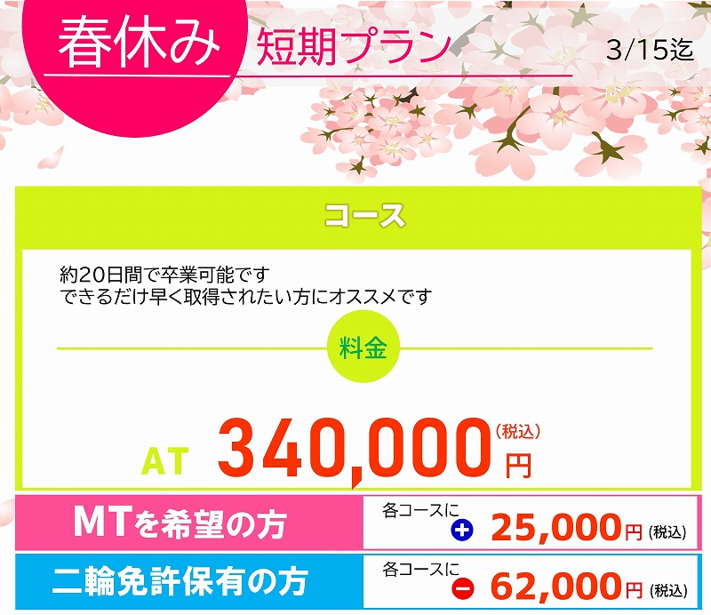 そこで、ロイヤル広島では、お客様が混み合う時期であってもスムーズに免許を取得していただけるように、春の短期コースプランを開始致します。こちらのプランで御入校された場合は、混み合う時期であっても技能教習予約を当校が取得するので、スムーズに教習を進められるようになります。