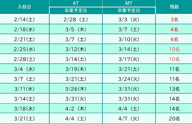 表の残数は、入校できる残り人数となります。