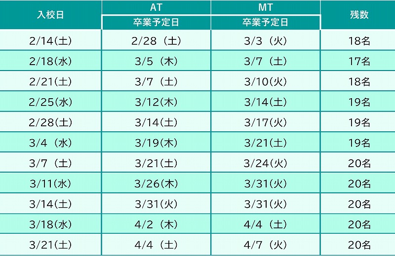 春休み短期コースの日程と残り枠数は、以下のようになります※残り枠数は、随時更新されますのでご注意ください。最終更新日:2025年12月16日
