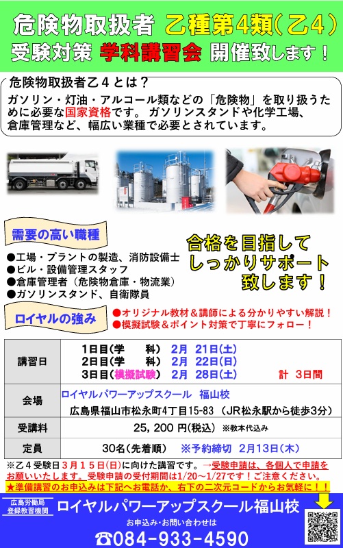 この度、国家資格の危険物取扱者(乙4)の学科受験対策 準備講習会を開催致します。学科合格をしっかりサポート致します!!