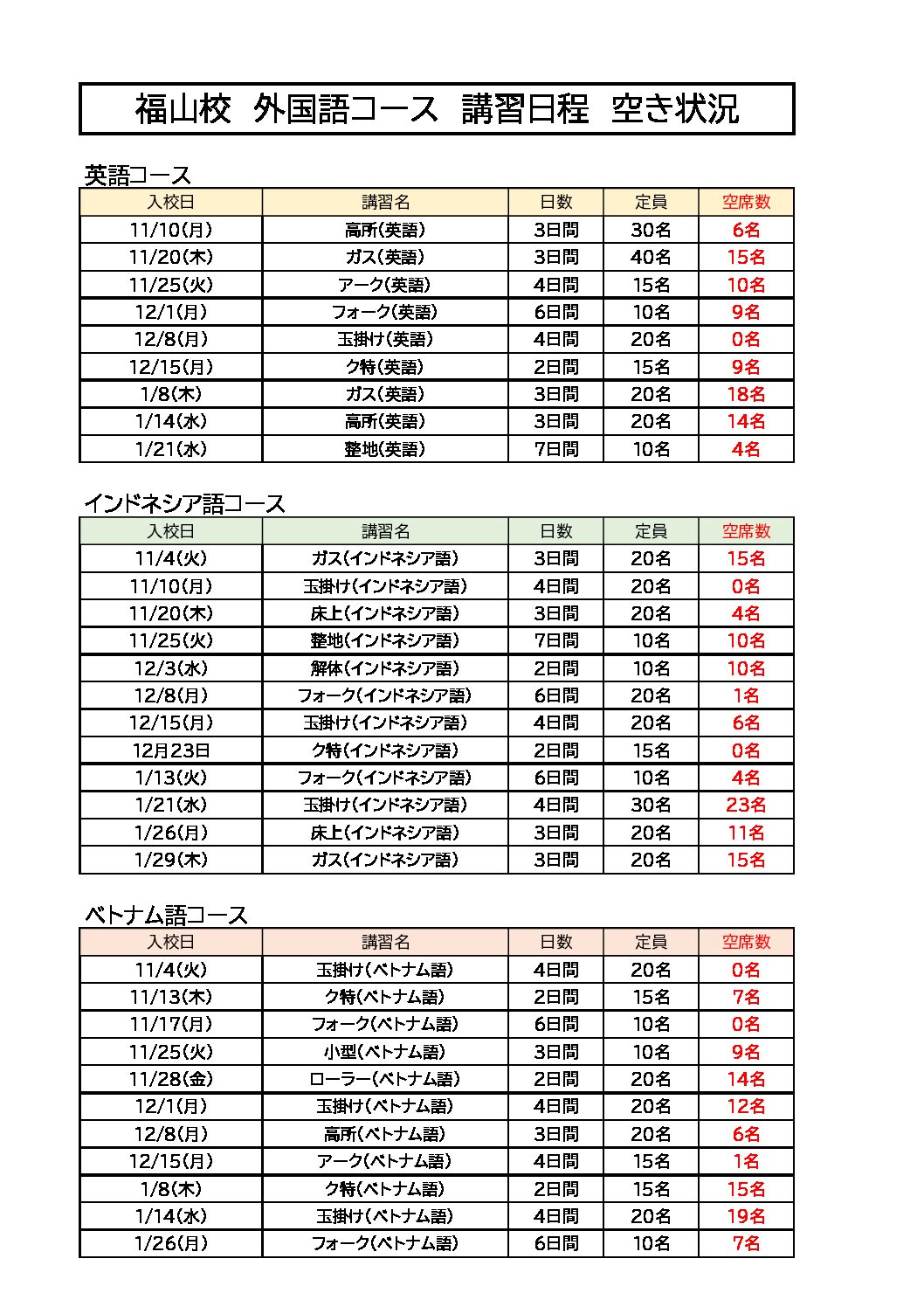 福山校 外国語コース 日程空き状況のお知らせ 2025年10月18日 講習日程 福山校で実施している外国語コース英語、インドネシア語、ベトナム語の講習日程空き状況をご案内いたします。 本ページ内にある空き日程の一覧表をご確認ください。お問い合わせは下記までお気軽に!!↓お電話 084-933-4590 講習日程ページはこちらから
