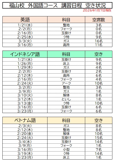 福山校 外国語コース 日程空き状況のお知らせ 2026年1月7日 講習日程 福山校で実施している外国語コース英語、インドネシア語、ベトナム語の講習日程空き状況をご案内いたします。 本ページ内に記載している空き日程の一覧表をご確認ください。(空き状況は1月7日現在) お問い合わせは下記までお気軽に!!↓お電話 084-933-4590 講習日程ページはこちらから
