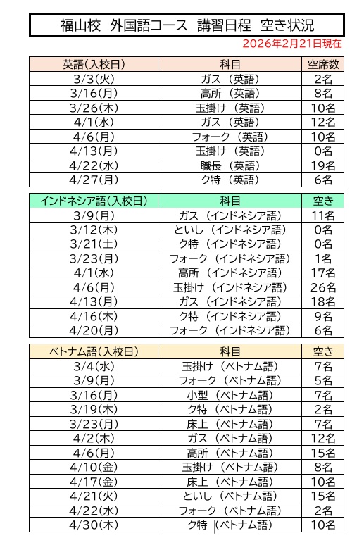 福山校 外国語コース 日程空き状況のお知らせ 2026年2月3日 講習日程 福山校で実施している外国語コース英語、インドネシア語、ベトナム語の講習日程空き状況をご案内いたします。 本ページ内に記載している空き日程の一覧表をご確認ください。(空き状況は2月21日現在) お問い合わせは下記までお気軽に!!↓お電話 084-933-4590 講習日程ページはこちらから
