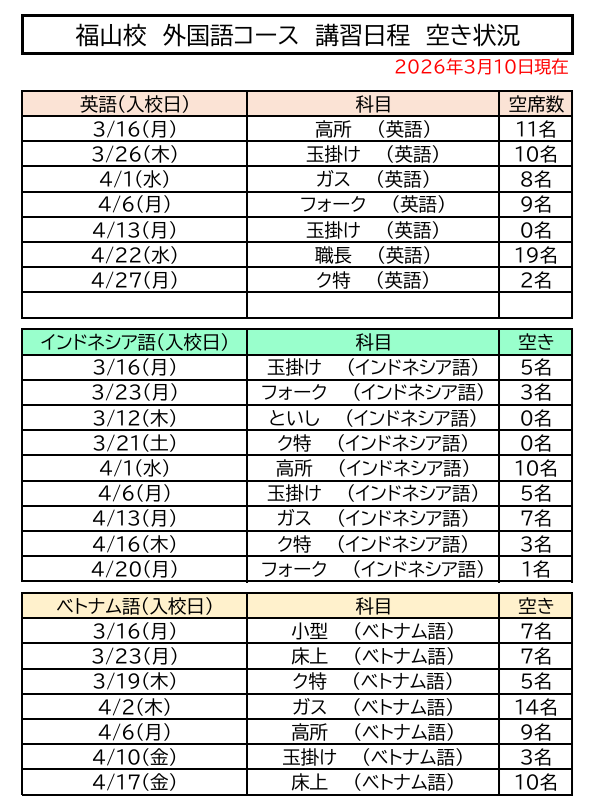 福山校 外国語コース 日程空き状況のお知らせ 2026年2月3日 講習日程 福山校で実施している外国語コース英語、インドネシア語、ベトナム語の講習日程空き状況をご案内いたします。 本ページ内に記載している空き日程の一覧表をご確認ください。(空き状況は3月10日現在) お問い合わせは下記までお気軽に!!↓お電話 084-933-4590 講習日程ページはこちらから