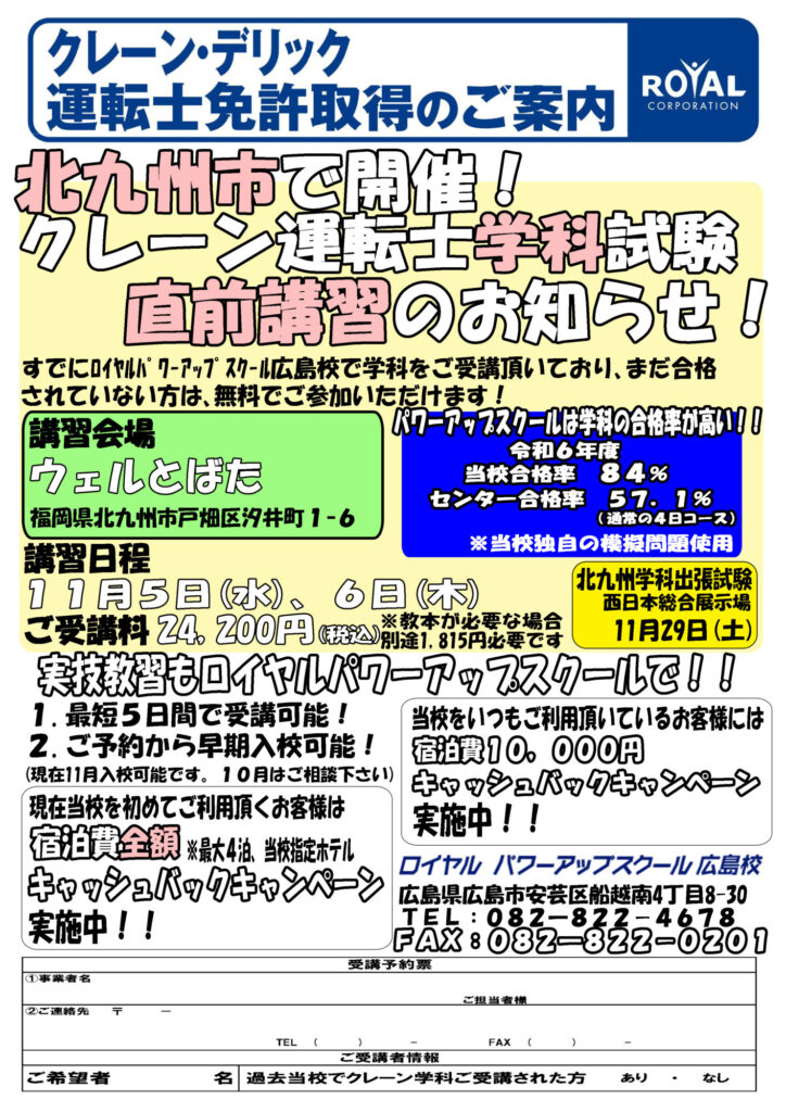 北九州市で行われる出張学科試験11月29日(土)に合わせ、北九州市で学科試験直前講習を開催します! 令和6年度センターの合格率57.1%の所、当校は84%の合格率を達成しています。ぜひこの機会にご参加下さい!